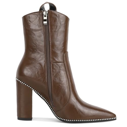 • Ankle Boots for Women: Classic ankle booties provide you a comfortable and gentle fit, offering every step stable and elegant. This pair of ankle boots uses 4inch/9.5cm chunky heel.The pointed toe and side zipper design make these cowboy boots full of western style. Chunky Heel boots matte leather could meet your various matching needs