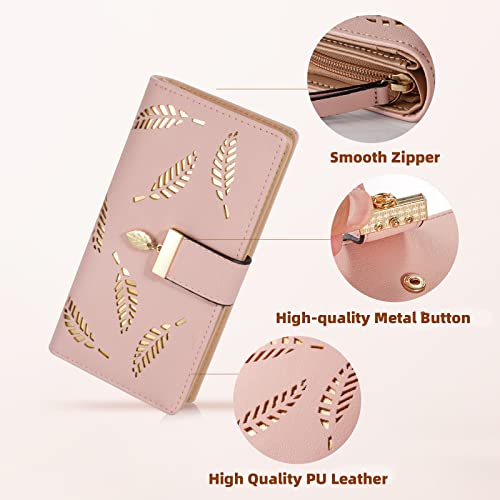 Women's Long Leaf Bifold Wallet Leather Card Holder Purse Zipper Buckle Elegant Clutch Wallet Handbag for Women - Pink 4