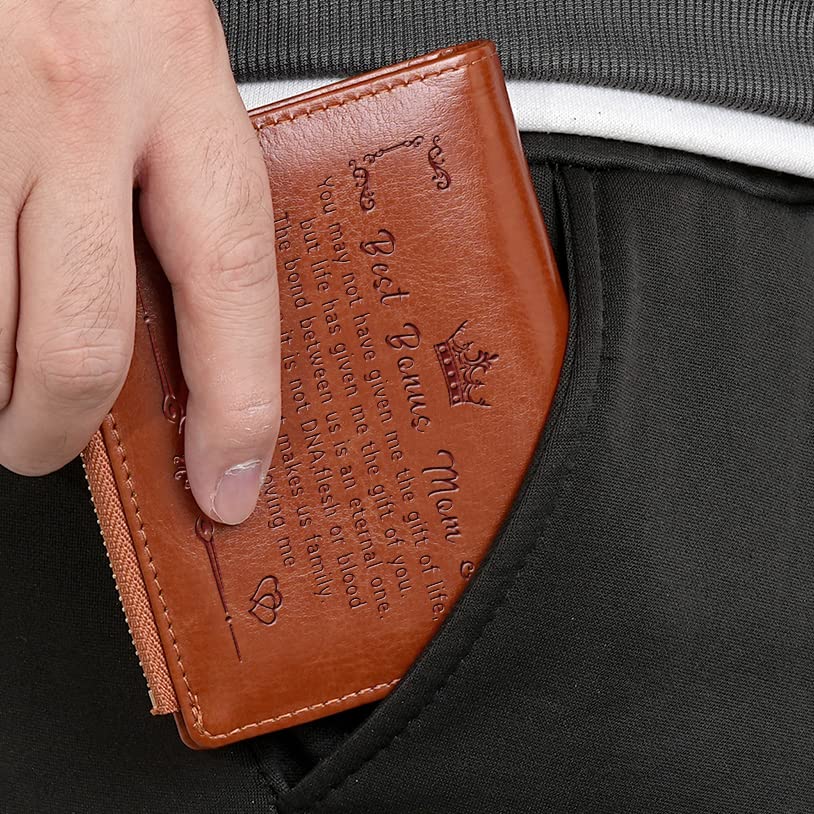 • Leather Wallet Engraved " best bonus mom you may not have given me the gift of you. the bond between us is an eternal one because it is not DNA,flesh or blood but heart that makes us family thank you for loving me as your own"