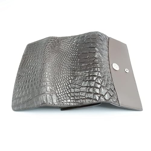 • ฺBrand: EXSOOTTI Made in Thailand Material: Crocodile leather Color: Brown Size: 4.5 X 7.5 x 1 inch. Weight: 200 grams. 6 Bank note slots 11 Credit card slots 1 ID card slot 1 zipper coin slot