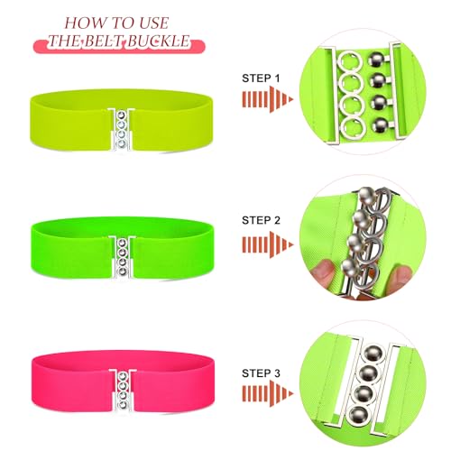 Syhood 3 Pcs 80s Neon Belts for Women 80s Waist Stretch Wide Waistband with Vertical Clasp Buckle Belts for Party Accessories(Green, Yellow and Pink,3 Pieces) 4