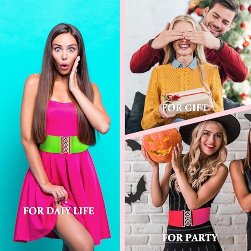 Syhood 3 Pcs 80s Neon Belts for Women 80s Waist Stretch Wide Waistband with Vertical Clasp Buckle Belts for Party Accessories(Green, Yellow and Pink,3 Pieces) 6