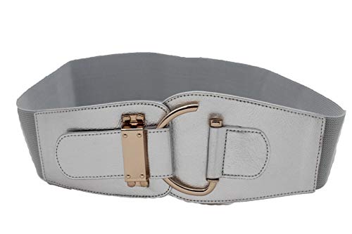 Women Elastic Fashion Faux Leather Belt Hip Waist Gold Metal Buckle Fits S M Metallic Silver Color 1