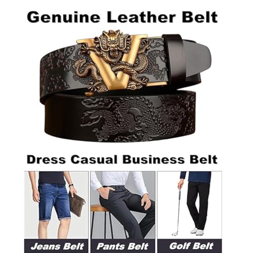 Embossed Dragon Pattern Ratchet Leather Belt with Carved Gold V-Dragon Automatic Sliding Buckle Handmade Waist Strap 1
