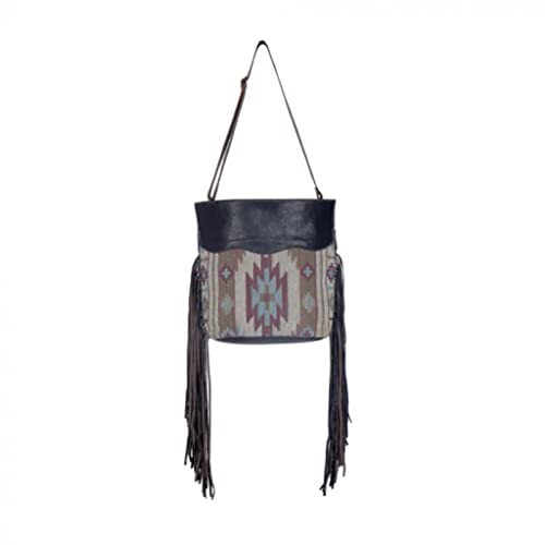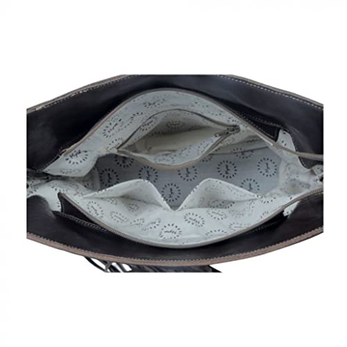 • The embossed leather on top gives it a sophisticated look, while the fringes on both sides add a touch of fun. The unique pattern ensures that no two bags are exactly alike. Whether you're headed to the office or the mall, this bag is sure to turn heads.