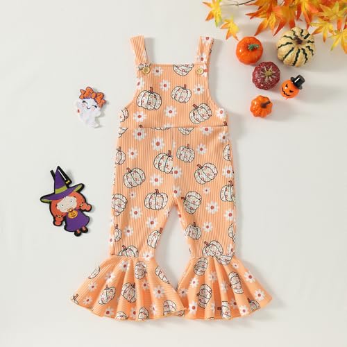 Noubeau Toddler Baby Girls Halloween Outfit Pumpkin Dot Suspender Romper Jumpsuit Bell-Bottom Pants Fall Girl Clothes 4