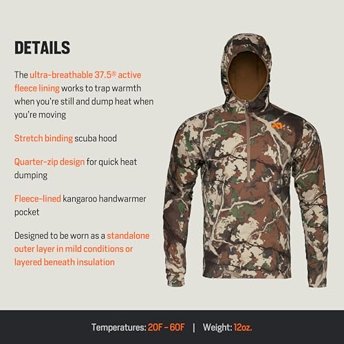 • This versatile hunting hoodie features 37.5 active fleece lining that automatically traps warmth when stationary and releases heat during movement, making it essential hunting gear for men who need consistent comfort across changing activity levels and conditions