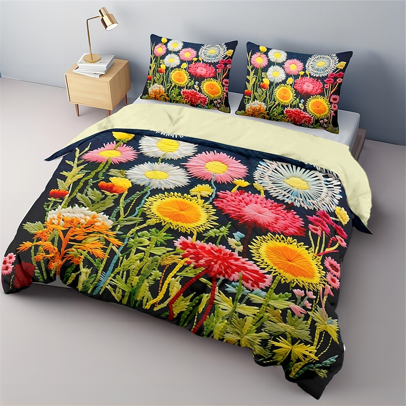 Floral Quilt Art Pattern Duvet Cover Set Comforter Set Soft 3-Piece Luxury Cotton Bedding Set Home Decor Gift King Queen Full Size 1