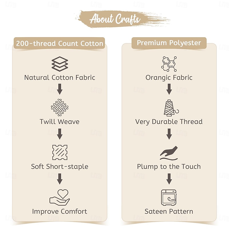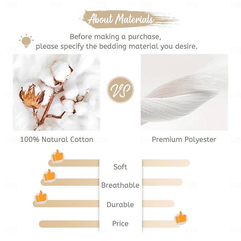 Highlights We offer two Fabric Options-- Option 1:Made from 100% natural cotton , features soft, breathable and lightweight.High-density weave with 200-thread count ,will get MORE COMFORTABLE AND DURABLE.The cotton duvet cover set is suitable for all seasons to provide the premium sleeping experience for your family. Option 2: Crafted from 100% premium polyester microfiber fabric with double-brushed process,ULTRA SOFT,BREATHABLE,SKIN FRIENDLY,wrinkle and fade resistance.For households or other places that frequently change duvet covers, polyester is a more cost-effective choice. Note: It is recommended to wash 1-2 times after receiving it, the fabric will become softer and more skin-friendly.