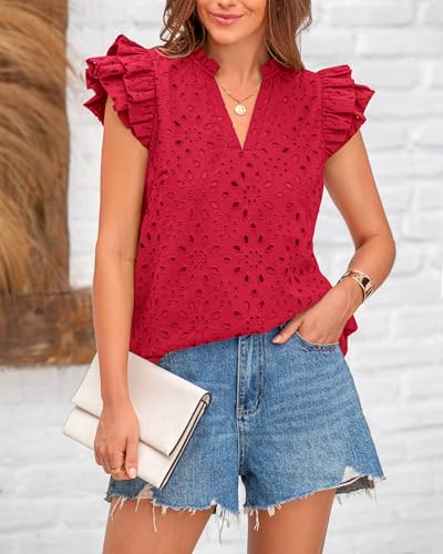 • FEATURES: S=US 4-6, M=US 8-10, L=US 12-14, XL=US 16-18, XXL=US 20-22 / Blouses For Women Dressy Casual / Eyelet Tops For Women / Embroidered Tunic Tops / V Neck Shirts / Ruffle Cap Sleeve Tops / Hollow Out Top / Curved Hem / Solid Color / Double Layer Fabric