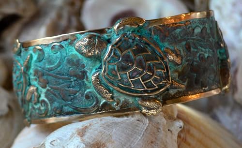 Material: BrassMetal type: BrassClasp type: Lobster ClawChain type: Curb ChainELEGANT DESIGN: This sea turtle brass cuff bracelet for women by Elaine Coyne Jewelry features a verdigris patina finish and a 1-inch wide cuff style. It showcases a beautifully crafted sea turtle design that embodies oceanic elegance. More than just a stylish accessory, it’s a tribute to marine life. Each handmade piece is unique, blending natural charm with timeless sophistication. It is ideal for ocean lovers and those who value fine craftsmanship.ADJUSTABLE FIT: Each of our sea turtle bracelets for women is designed to be one size fits all. All Elaine Coyne cuff bracelets can be easily adjusted by gently pushing the ends together for a snug fit or pulling them apart slightly for a more loose fit. Our cuff bracelets are dip coated with custom made acrylic finish to ensures lasting beauty by preventing tarnishing and maintaining its vibrant verdigris patina brass.ARTISAN CRAFTMANSHIP: Crafted by skilled artisans trained by renowned designer Elaine Coyne, each of our cuff bracelets is meticulously created with the care and precision of fine sculpture. Using heat, torches, and a unique combination of elements, these sea turtle bracelets for women bring Elaine Coyne's vision to life, setting her work apart from other designers and making them perfect for nature enthusiasts seeking wearable art.A THOUGHTFUL GIFT: Our sea turtle cuff bracelet features a verdigris patina; it is a one-of-a-kind turtle bracelet, reflecting the exceptional artistry of the Elaine Coyne Jewelry Collection. This is one of our best selling cuffs because it offering a blend of individuality and ocean-inspired elegance. This brass cuff bracelet is ideal whether for you or for celebrating friendship, birthdays, and other memorable moments.SIGNATURE ARTISTRY: Each piece from the Elaine Coyne Jewelry Collection is more than just an accessory; it's a work of art. The sea turtle bracelet for women is a testament to this, featuring exclusive techniques that result in unparalleled designs. Embrace a piece of wearable art that stands out with its distinctive style and craftsmanship. Our handmade sea turtle bracelet is a true masterpiece, combining intricate design with the timeless allure of brass.MESSAGE FROM ELAINE: I remember walking along the beach when we stumbled upon a magnificent sight: a nest of sea turtles, each emerging from its shell. I recall the excitement as we gently picked up each newborn turtle and guided them toward the ocean. We wondered if our small act of kindness would make a difference—would our baby sea turtles thrive? Inspired by that experience, I present baby sea turtles in a delicate, fine form, reflecting the beauty of their early journey. Perfect for everyday use. supreme materials and excellent craftsmanship ensure long-lasting durability.