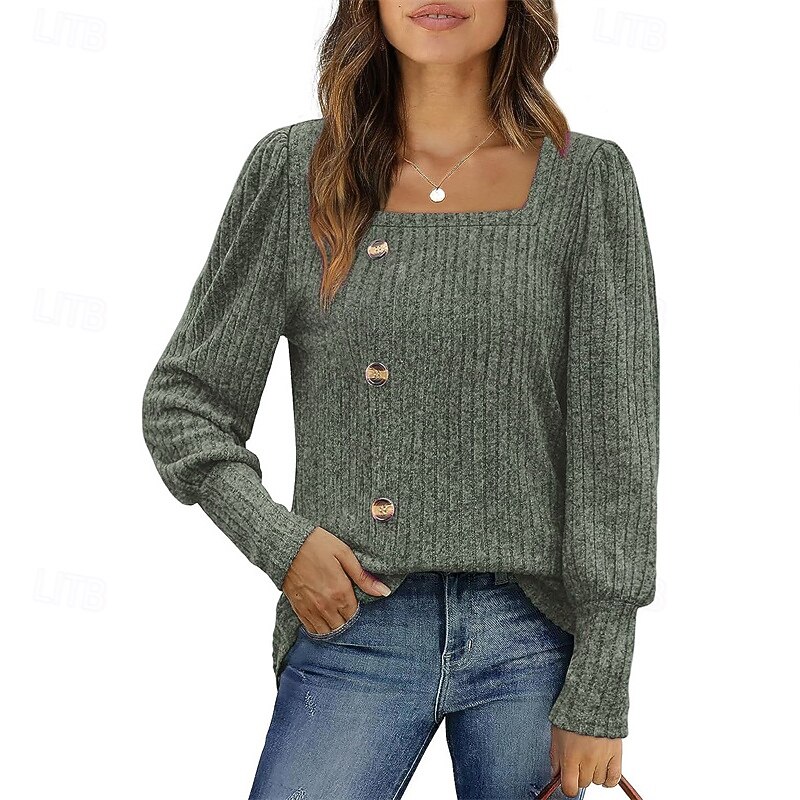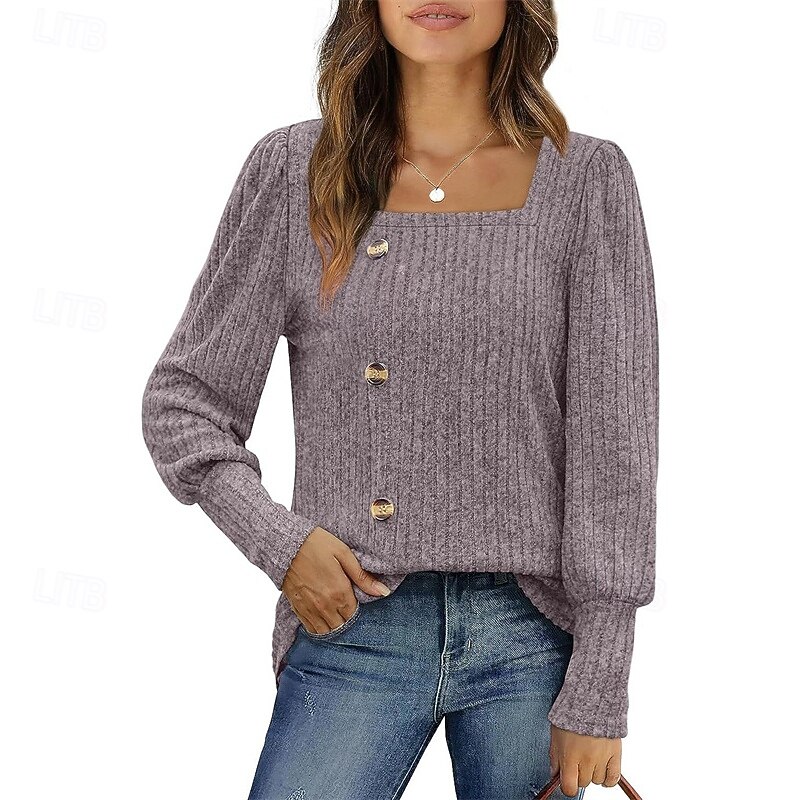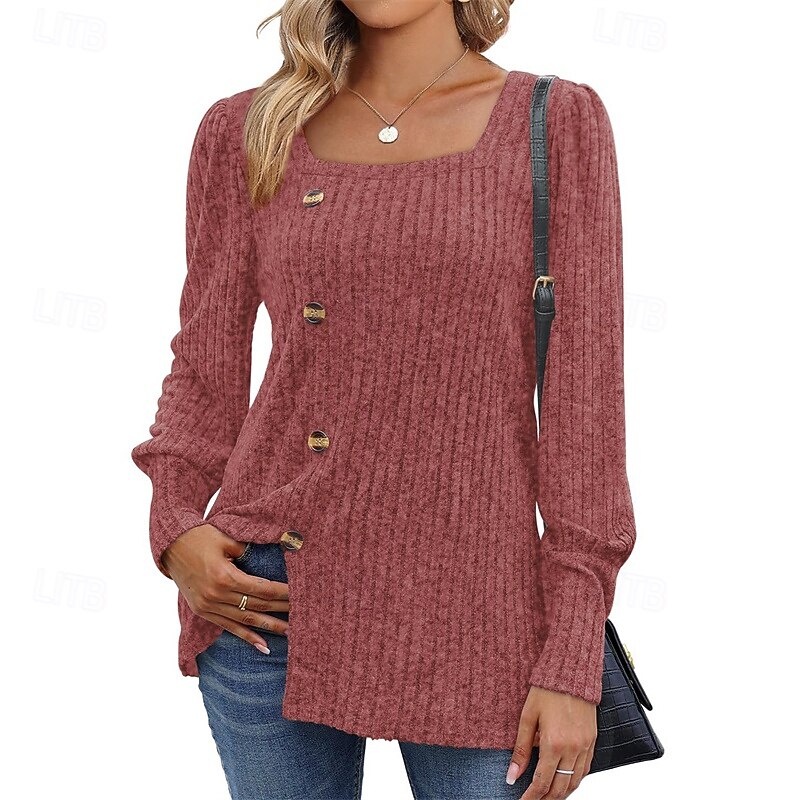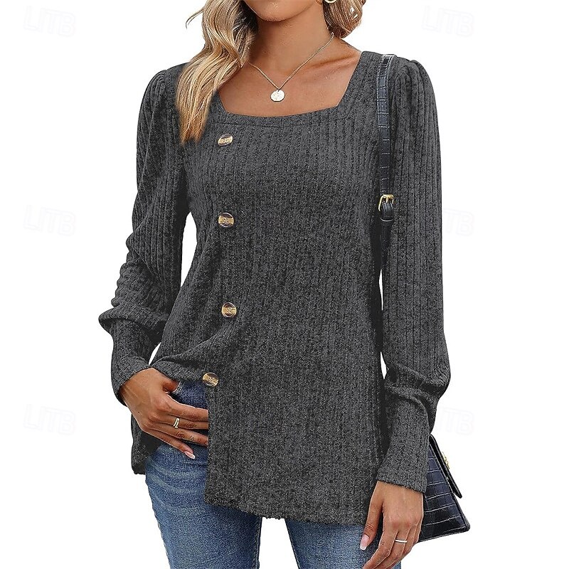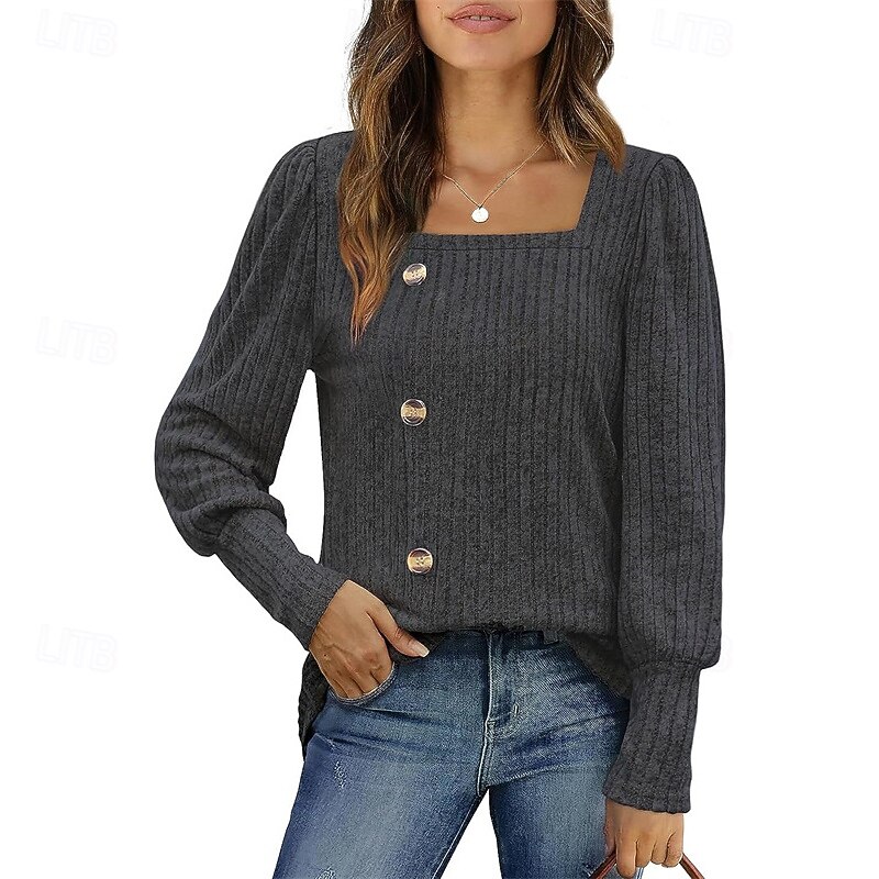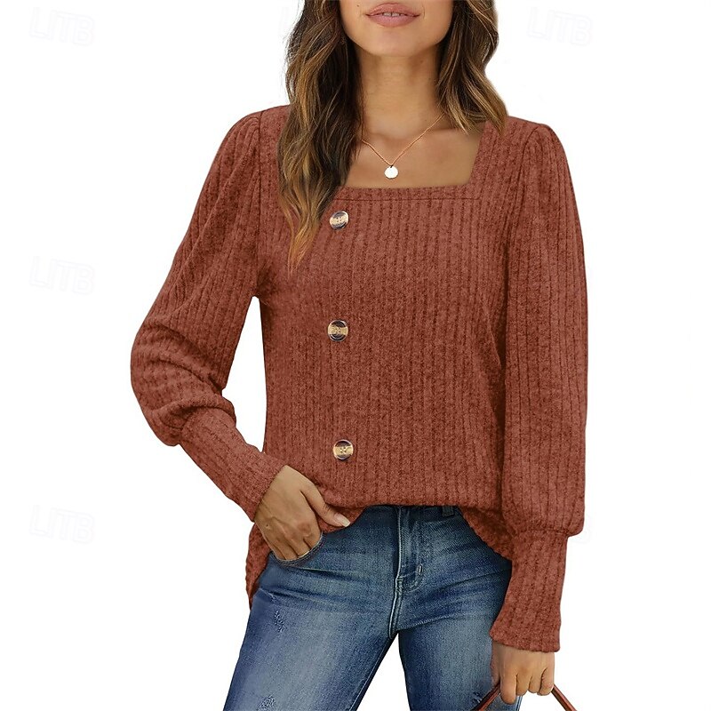 More information about Women's Texture Blouse T Shirt Tee Top Plain Fashion Modern Long Sleeve Square Neck Regular Tops Daily Going out Buttons Maroon Black Red Light Brown Blue Spring Fall