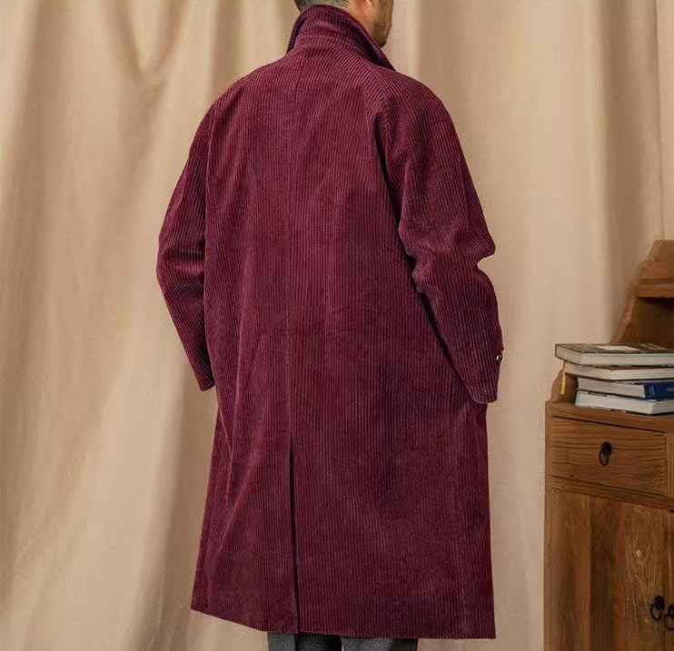 Men's Corduroy Trench Coat Notched Lapel Windbreaker Man's Casual Long Jacket Overcoat Pea Coat 4