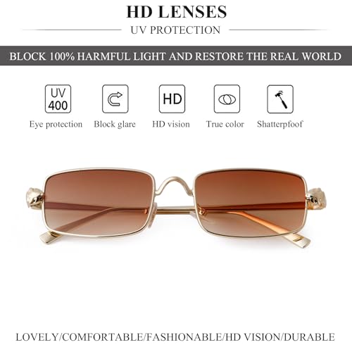 • GOLD FRAME SUNGLASSES WOMEN MEN - These metal frame rectangle sunglasses for women men are made from premium lightweight metal materials,rectangular narrow square shape frame designed not only offers a wide field of vision ,and also adds a touch of elegance and sophistication to any outfit