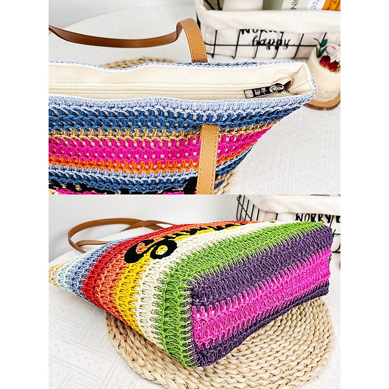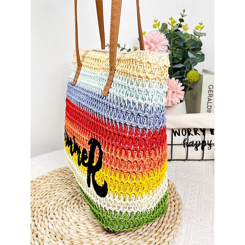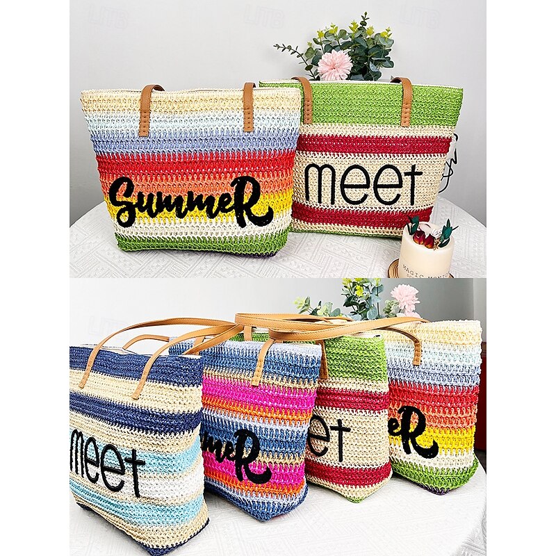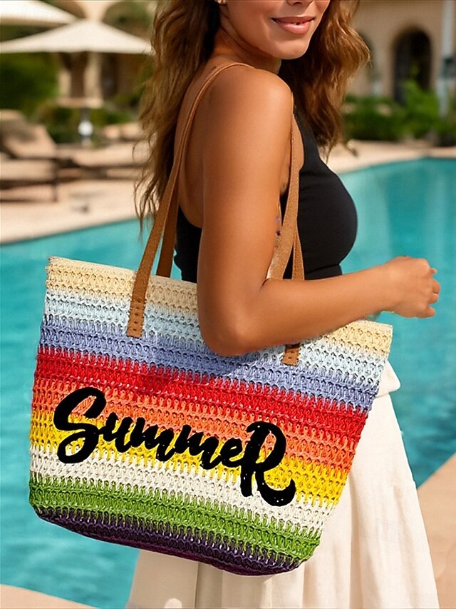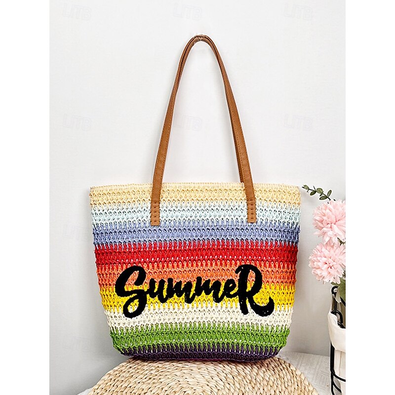 HOT ! Women's Colorful Summer Tote Bag with "Summer" Print - Stylish Crochet Beach Tote Bag for Vacation and Poolside