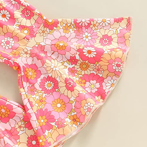 Toddler Summer Clothes Baby Girl Bell Bottom Outfit Short Sleeve Rainbow Print T-shirt Tops+Floral Flare Pant Set 6