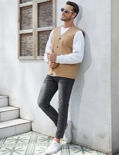Gihuo Men's Travel Vest Casual Outdoor Multi-Pocket V-Neck Button Cotton Workwear Vest 7