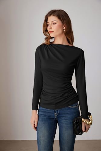 HOT ! GRACE KARIN 2025 Womens Long Sleeve Wrap Ruched Tops Boat Neck Dressy Casual Blouses Fall Fitted Trendy Shirt