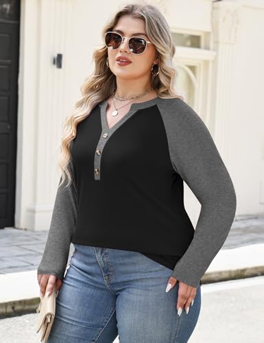 TFSDOD Plus Size Tops for Women Raglan Long Sleeve V Neck T Shirt Color Block Tunic Casual Loose Blouses 1