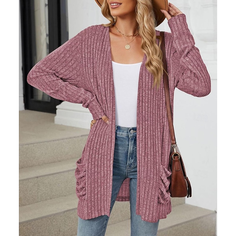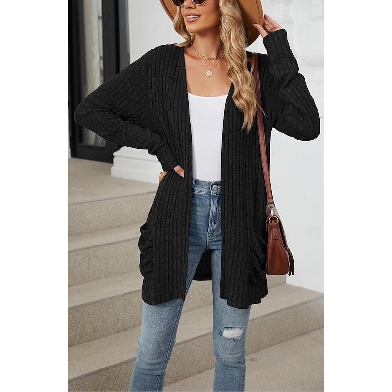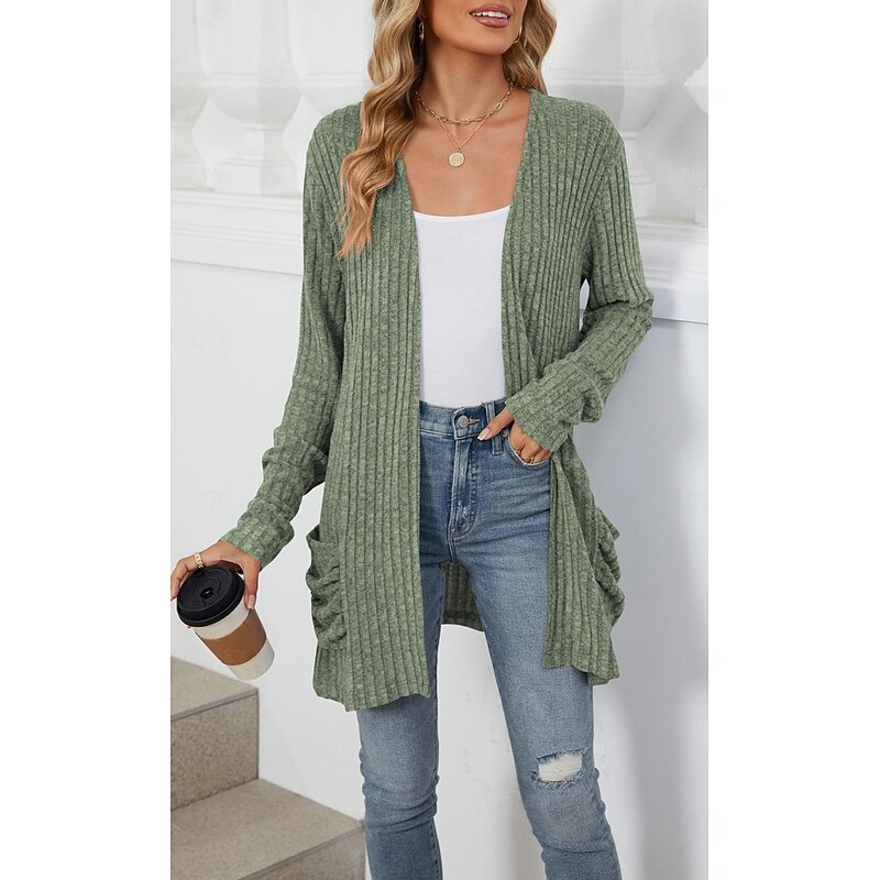 More information about Women's Cardigan Elegant Casual Solid Color Ribbed Open Front Pocket Long Sleeve Regular Tops Knit Work Daily Black Army Green Spring Fall