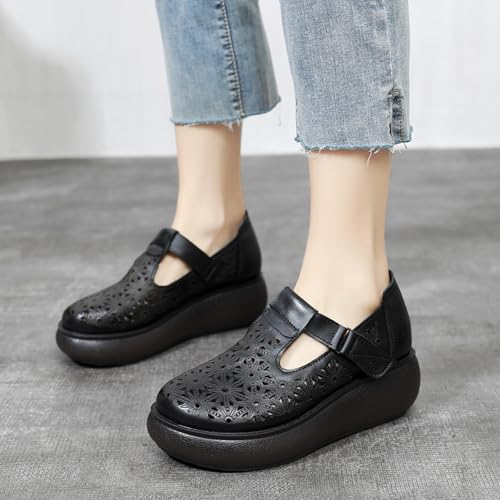Women's Genuine Leather Hollow Wedge Platform Slip on Rocking Shoes Retro Comfortable Breathable Non-Slip Round Toe Hook Loop Soft Sole Nurse Mom Loafers for Walking Party 6