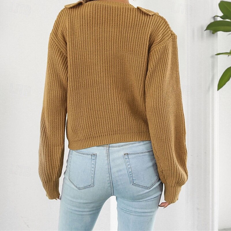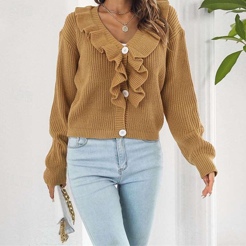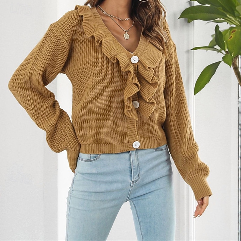 More information about Women's Pullover Casual Solid Color Chunky V Neck Ruffle Knitted Long Sleeve Regular Tops Knit Daily Holiday Going out White Yellow Fall Winter