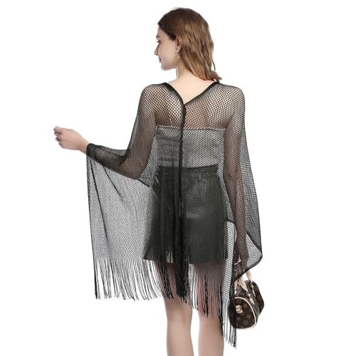 Women's Knit Shawl Wrap Metallic Fringe Poncho Sheer Fishnet Cape Top Soft Long Loose Swing Summer Beach Capelet 6