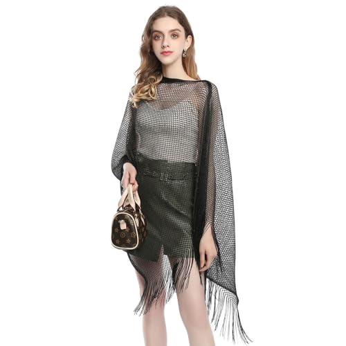 Women's Knit Shawl Wrap Metallic Fringe Poncho Sheer Fishnet Cape Top Soft Long Loose Swing Summer Beach Capelet 7