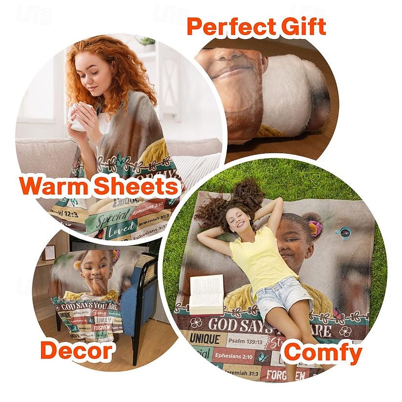 Highlights [Fabric] Crafted from a cotton and polyester blend, this blanket offers a soft and plush texture, ensuring warmth and comfort throughout all seasons. [Design and Style] The blanket is designed with a personalized touch, featuring a high-quality print. Its vibrant background, complete with whimsical floral and butterfly motifs, adds a lively and colorful dimension to any room. [Design Highlights] The centerpiece of this blanket is its inspirational theme, "God Says You Are," adorned with affirmations such as "Unique," "Strong," and "Loved," each matched with meaningful Bible verses. The design also includes a heartwarming image of a smiling child with bright hair accessories, adding a personal and uplifting element. [Occasions] Ideal for cozying up at home or as a heartfelt gift for a loved one, this blanket suits various occasions, whether it's a special celebration or a simple, comforting addition to your living space. [Size Range] Available in a generous size of 200cm by 150cm, this blanket is perfect for personal use or sharing, making it a versatile choice for different settings and preferences.