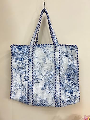 Quilted Beach Tote Bag with Tropical Palm Print, Blue and White, Cotton Canvas, Large Carry-All for Summer 2