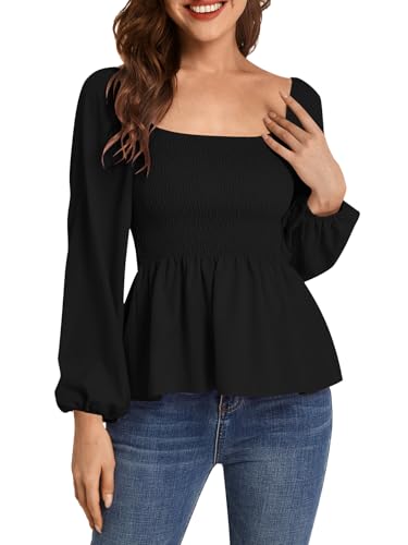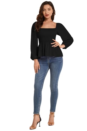 Umenlele Women's Long Sleeve Square Neck Shirred Ruched Ruffle Peplum Blouse Shirt Tops 1