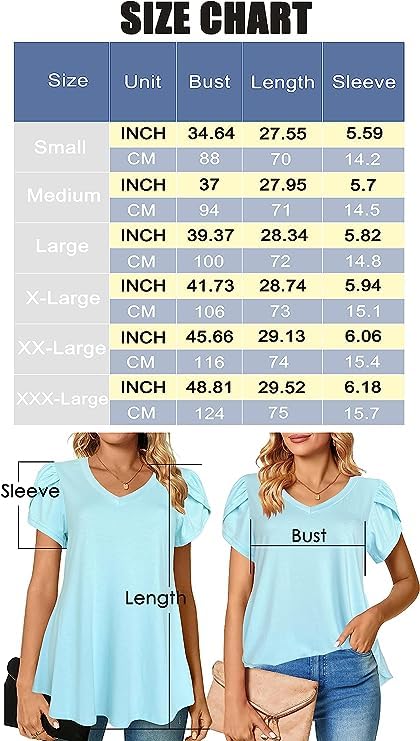 • Short sleeve,v neck, Petal Sleeve,loose casual style,This versatile v neck t shirt is for effortless styling your way!It fits the body of most Lady's shape,allows you come with a various look from comfy to chic and stylish.
