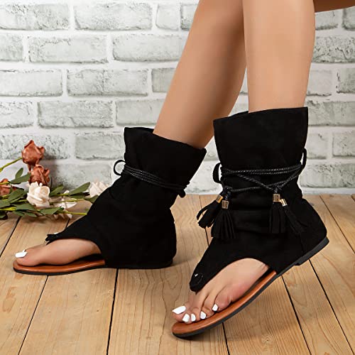 Retro Flat Tassel Gladiator Sandals for Women Bohemian Clip-Toe Flocking Fringe Sandals Casual Summer T-Strap Sandals 5