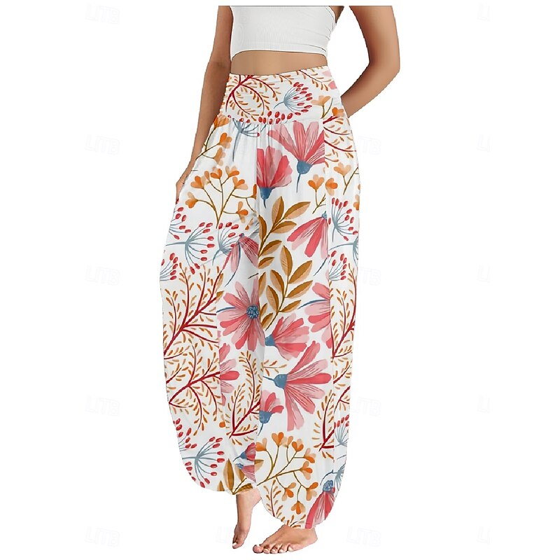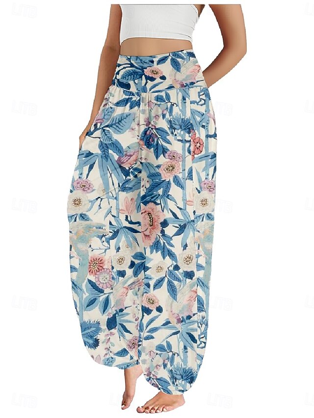 Women's Linen-Inspired Pants Wide Leg Pants Trousers Ethnic Style Casual Boho Full Length High Waist Floral Pocket Elastic Waist Printing Breathability Soft Micro-elastic Outdoor Yoga Light Green 24