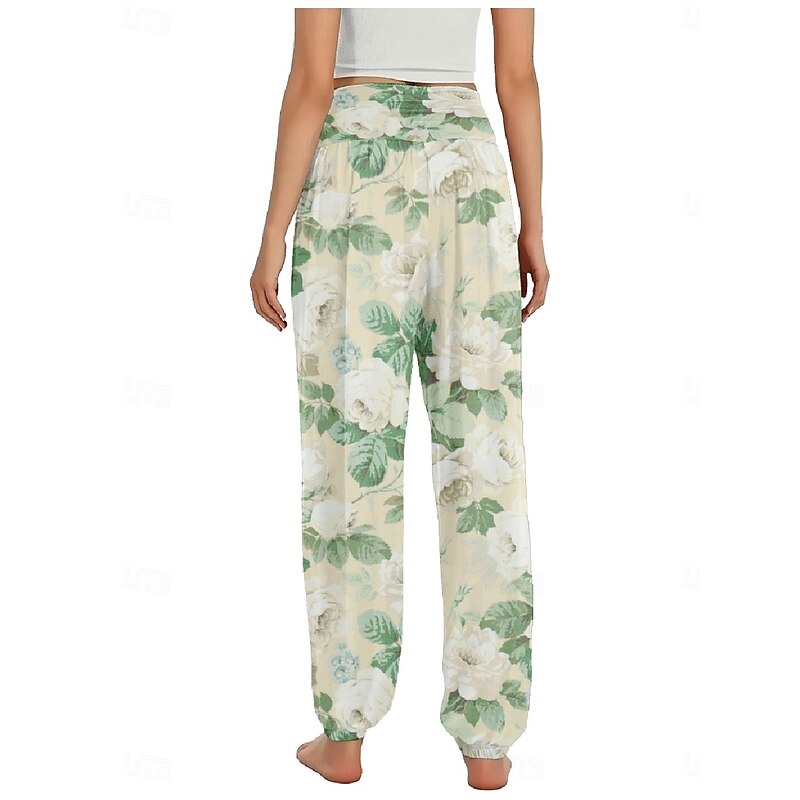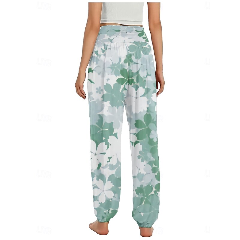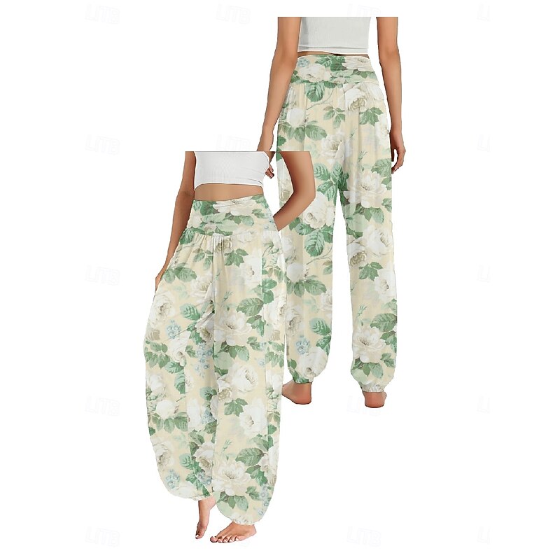 Women's Linen-Inspired Pants Wide Leg Pants Trousers Ethnic Style Casual Boho Full Length High Waist Floral Pocket Elastic Waist Printing Breathability Soft Micro-elastic Outdoor Yoga Light Green 15