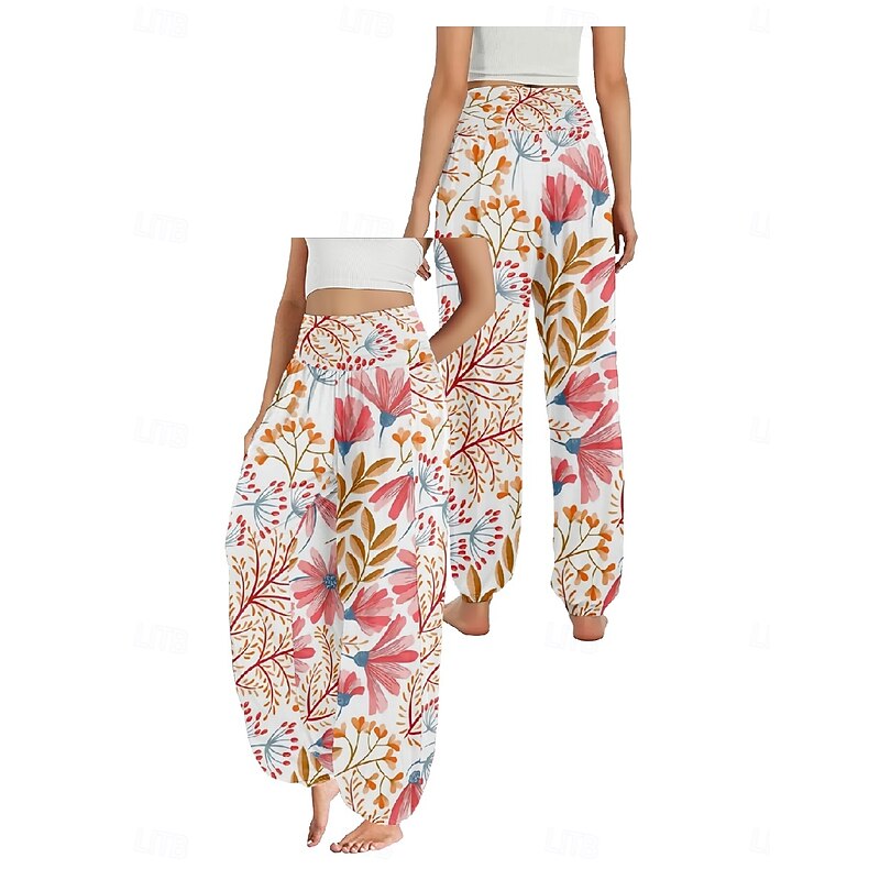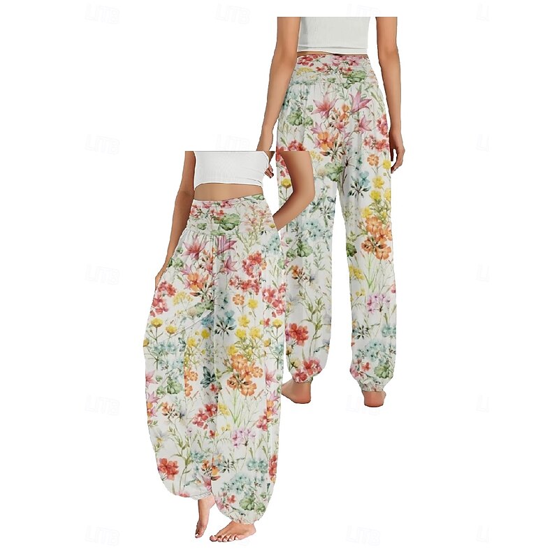 More information about Women's Linen-Inspired Pants Wide Leg Pants Trousers Ethnic Style Casual Boho Full Length High Waist Floral Pocket Elastic Waist Printing Breathability Soft Micro-elastic Outdoor Yoga Light Green