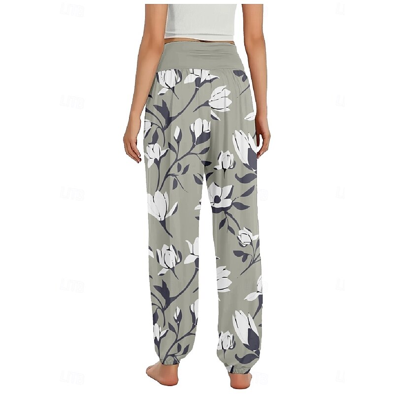 Women's Linen-Inspired Pants Wide Leg Pants Trousers Ethnic Style Casual Boho Full Length High Waist Floral Pocket Elastic Waist Printing Breathability Soft Micro-elastic Outdoor Yoga Light Green 26
