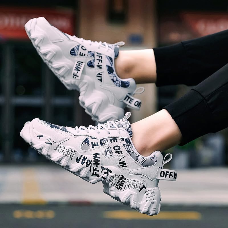 More information about Y2K Leather Graffiti Print White Sneakers for Men Lightweight Comfortable Lace Up Round Toe Shoes for Teens Campus Sports Casual Outfits Street Style Inspired