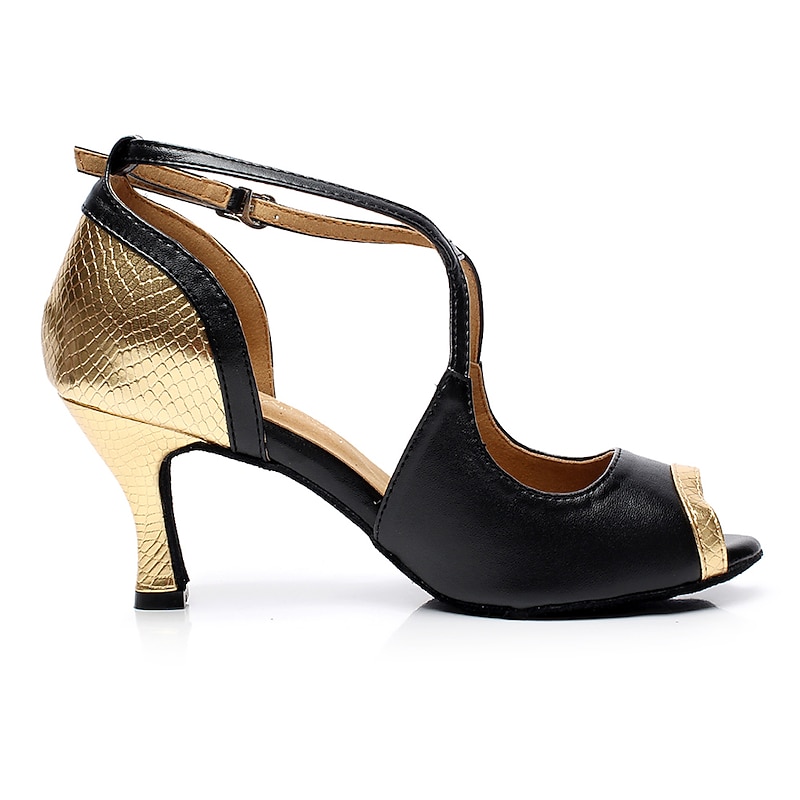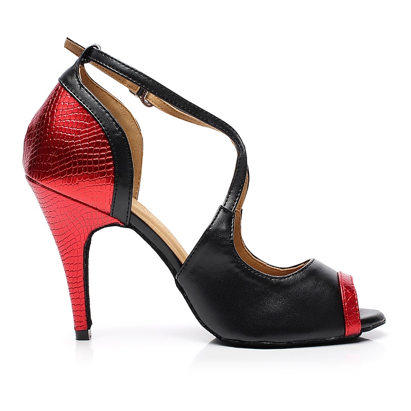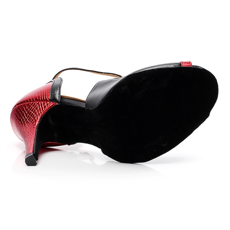 Highlights [Fabric and Materials] : Crafted from high-quality faux leather, these Latin dance shoes feature a sleek and smooth finish. The upper includes vibrant red faux snakeskin accents, adding a pop of color and exotic texture. The suede outsole provides excellent flexibility and grip, essential for dancing. [Style and Fit] : The slim high heel design is both stylish and functional, offering a moderate height of 2 3/4 inches (7cm) for a balance of comfort and elegance. The T-strap with an adjustable ankle buckle ensures a secure and custom fit, allowing for freedom and confidence on the dance floor. [Design Highlights] : These shoes are a standout choice with their sparkling gold and red color options. The open-toe style coupled with bold faux snakeskin accents on the toe and heel exudes sophistication. The combination of textures and colors makes them perfect for enhancing your dance performance. [Occasions] : Ideal for performances and practice sessions, these women's Latin dance shoes are versatile enough for any salsa or ballroom setting. They bring an element of glamour and flair, making them suitable for both competitive and recreational dance events. [Size Availability] : The shoes are available in a broad range of sizes, from US3.5 to US12, ensuring an appropriate fit for various foot sizes. This range allows dancers to select the perfect size for optimal comfort and performance.