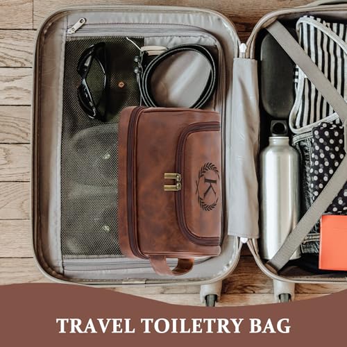 HOT ! Personalized Christmas Birthday Gifts Toiletry Bag for Men Dad Husband, Custom Initial PU Leather Waterproof Toiletry Organizer Dopp Kit Shaving Bag Travel Essential for Men, Reddish Brown J
