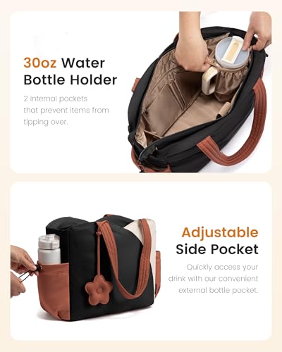 • Spacious and Well-Organized: This tote bag with zipper features an 11-pocket design for optimal organization. The padded laptop tote bag for women securely holds laptops up to 15.6 inches (medium) or 17.3 inches (large). With an internal water bottle pocket for a 30oz bottle and adjustable external pockets for umbrellas or smaller bottles, this work bag keeps essentials easily accessible.
