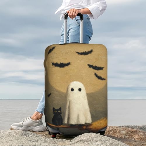 HOT ! Cute Ghost White Cat Sitting On Broom Elastic Travel Luggage Covers Dustproof Scratch-Resistant Suitcase Protector Fit 22-24 Inch