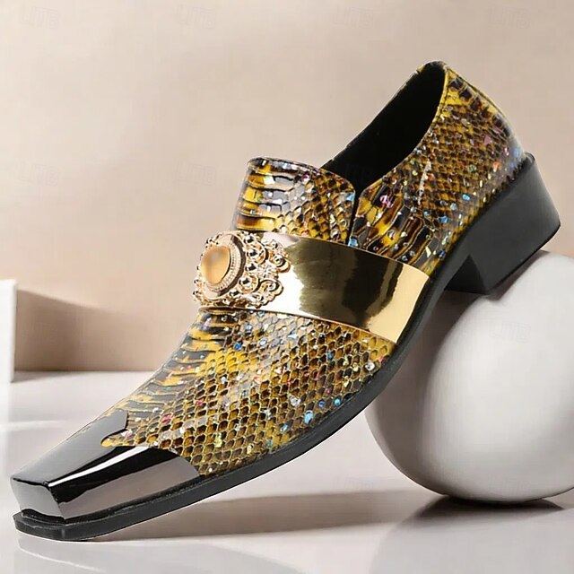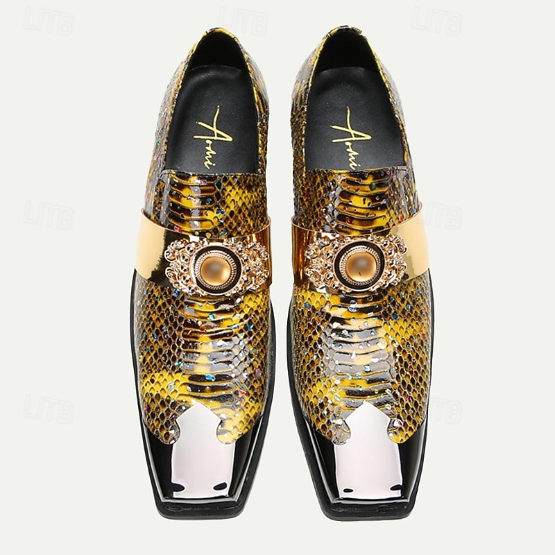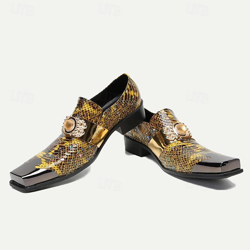 Men's Snake Print Leather Slip-On Dress Shoes with Gold Tip Gold Metal Embellishment–Premium Cowhide, Formal Party Footwear 1