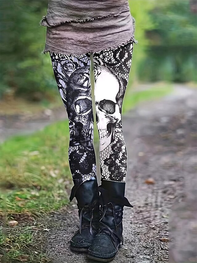 Women's Leggings Vacation Vintage Fashion Full Length High WaistPantsHalloween Graphic Skull Printing Soft Breathable Stretchy Outdoor Vacation Street milk white Dark-Gray Spring Fall Winter Skinny 1