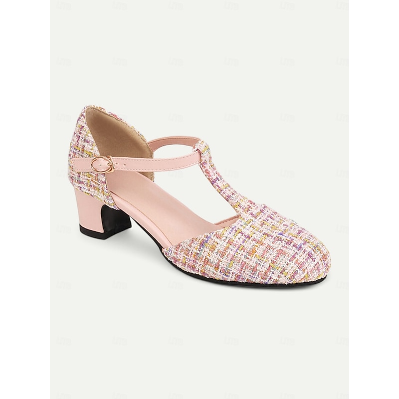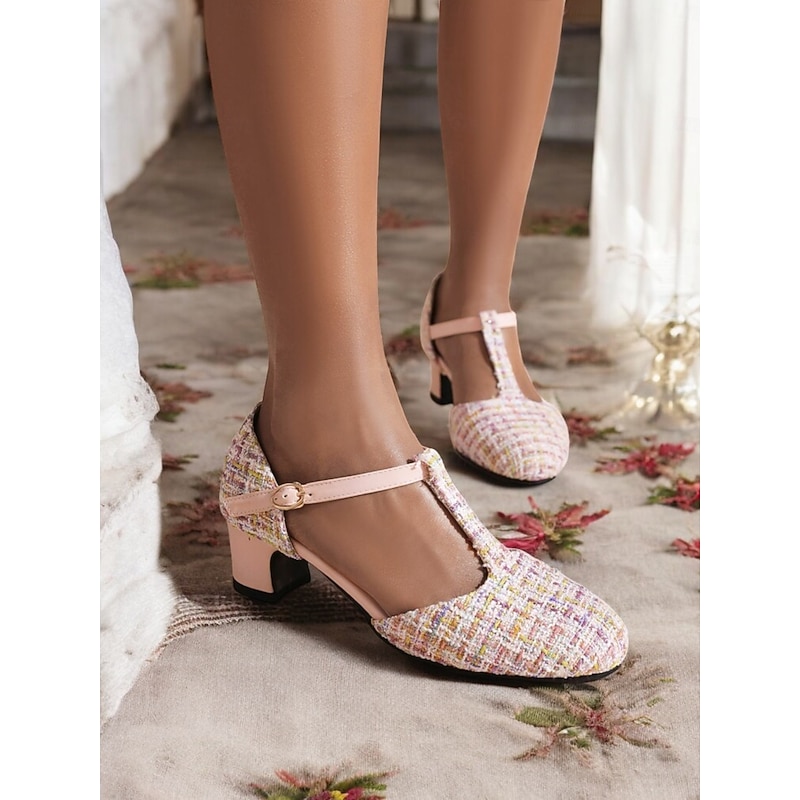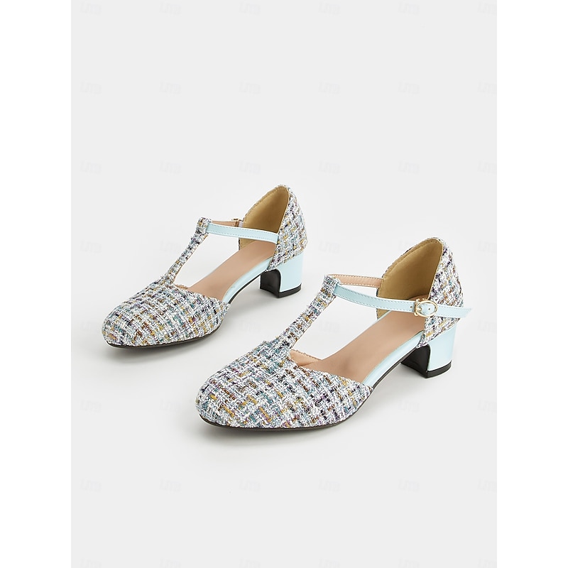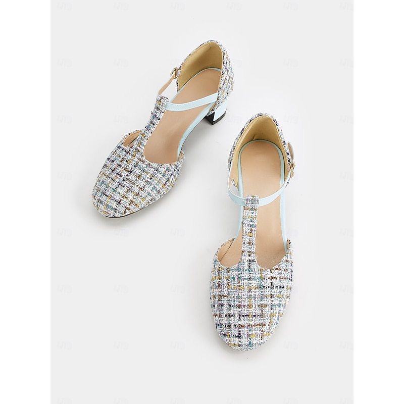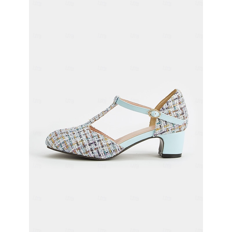 Women's 1950s Tweed T-Strap Mary Jane Heels – Vintage-Inspired Low Block Heel Shoes for Elegant Office Wear, Weddings, and Special Occasions 4