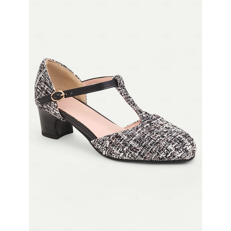 Women's 1950s Tweed T-Strap Mary Jane Heels – Vintage-Inspired Low Block Heel Shoes for Elegant Office Wear, Weddings, and Special Occasions 1