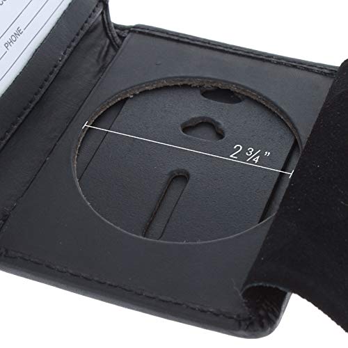 • SPECIFICATIONS: Dimensions: 4.5 x 3.5 x 1 inches; Max Card Size: 2.75" x 4"; Max Badge Size: 2.75 inches; Color: Black; Materials: Genuine Leather; Note: Badge attachment is clip-back, no screws required