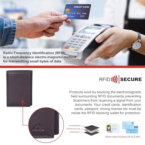 • RFID Blocking Feature Offers: Protection and Peace of Mind. Your Trifold Wallet is lined with high-security RFID technology that blocks all credit cards, debit cards, driver licenses, and ID cards that operate at a frequency of 13.56 MHz, so you can easily keep your cards and other documents in your wallet while traveling, working or having fun without fearing identity theft.