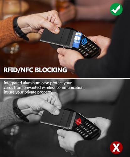 • RFID/NFC PROTECTION - Advanced aluminium builder offers the best solution for unpredictable risks from RFID/NFC scanning. and ensures thieves can’t hi-jack your credit card information. Inside strip holds cards tightly, so that your cards won't drop out even your turn the hard case upside down.
