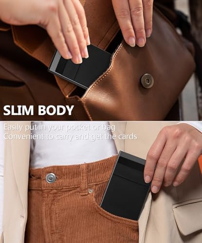 • QUICK ACCESS & LARGE CAPACITY - Fumbling through your pop up wallet should be a thing of the past. Our signature automatic mechanism ejects your cards at the flick of a switch. Hold 5 cards in pop up card case. 2-3 cards & bills available for 2 extra slots, the actual capacity depends on the card thickness.